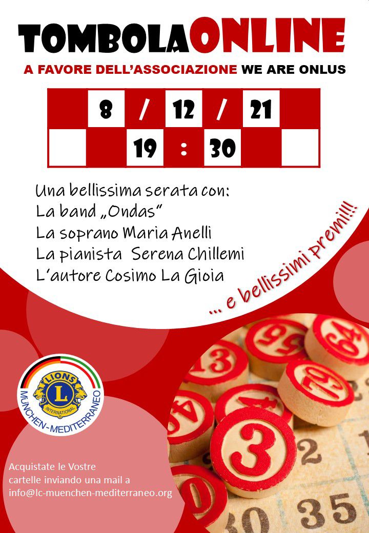 Mercoledì 8 dicembre alle ore 19:30 LIONS CLUB München Mediterraneo organizza una tombola online a favore dell'associazione We are onlus.