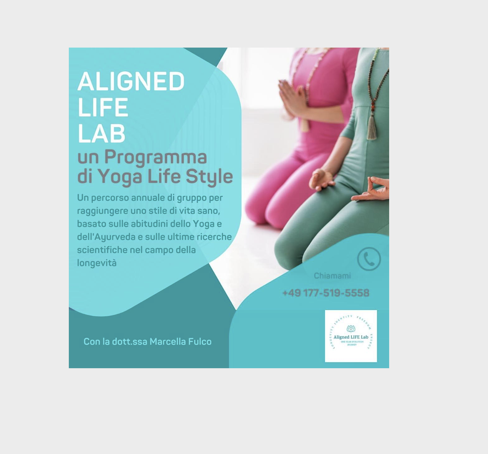 L'individuo deve vivere in allineamento con i cicli naturali, la scienza oggi lo dimostra continuamente. Ho partecipato al programma “Body Thrive” ideato da Cate Stillman, misurandomi con l´implementazione di alcune abitudini e routine nella vita quotidiana, tra cui lo yoga, con un approccio sperimentale. Visto il buon successo ottenuto su di me, ho deciso di offrire un programma simile di Health Coaching on line della durata di un anno. 12 incontri per quadrimestre di un'ora e mezza ciascuno dove si prendono in esame dieci abitudini (dall'alimentazione alla meditazione) che si dovrebbero introdurre nella propria vita quotidiana. La prima sessione è iniziata nell’ ottobre 2021. I risultati sono più che soddisfacenti. Il programma si chiama Aligned life Lab, un percorso di gruppo per raggiungere uno stile di vita sano basato appunto sulle abitudini dello yoga e dell´Ayurveda e sulle ultime ricerche scientifiche nel campo della longevità. Per saperne di più è possibile prenotare una prima sessione gratuita: troverete le informazioni sulla mia pagina facebook Marcella Fulco Yoga & Life Style Medicine, oppure altre informazioni sono disponibili sul mio sito web.